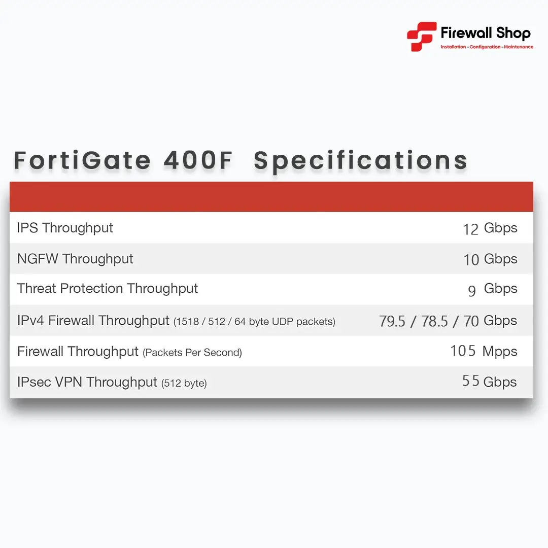 - Connectivité polyvalente : Le FortiGate 400F est doté de diverses interfaces, y compris des ports 1-Gigabit Ethernet (GbE), des ports 10-GbE, et d’autres options pour s’adapter à diverses configurations de réseau.