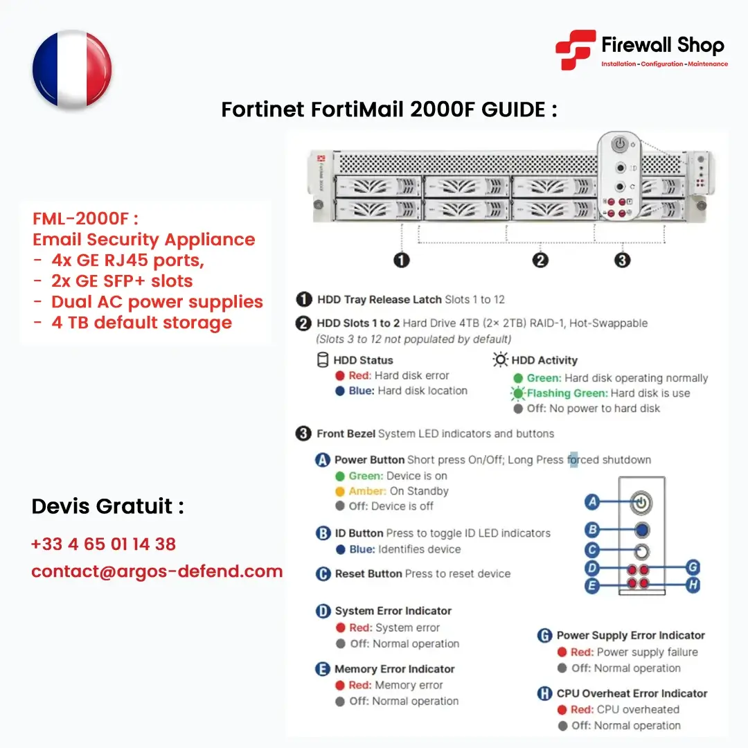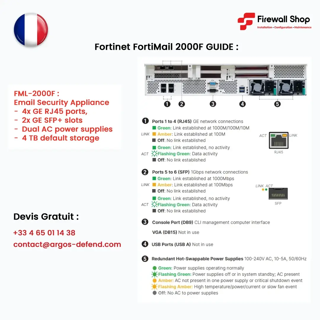 Obtenez votre devis personnalisé et gratuit pour le FortiMail 2000F, la solution de sécurité email haut de gamme de Fortinet, adaptée aux grandes organisations Françaises. Chez Firewall Experts France, nous vous accompagnons de l’audit à l’installation, avec des tarifs transparents et un support local certifié.